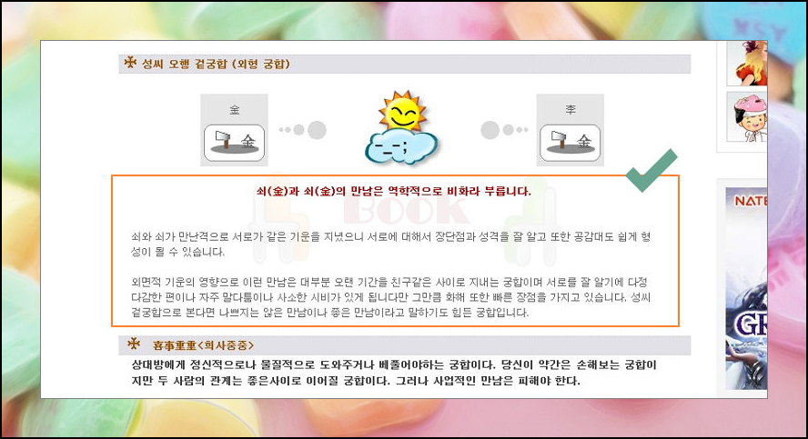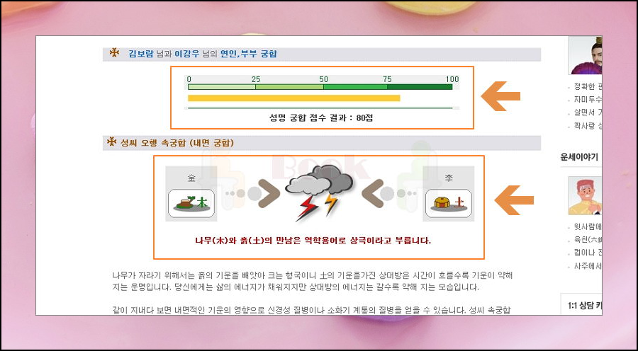 4. 궁합 점수로 둘 사이의 관계에 대해 파악할 수 있어요. 결과가 나왔어요. 궁합 점수를 통해 둘 사이의 애정운세 및 앞으로의 관계 등을 알 수 있어요. 내면 궁합을 보면 역학을 기준으로 풀이를 해주고 있는데요. 둘의 운명이 어떻게 되는지 알 수 있고, 둘 사이의 만남이 좋은지 나쁜지 알 수 있어요.
