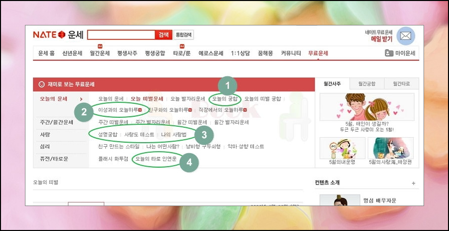 2. 다양한 무료 역술 서비스를 한눈에 볼 수 있어요. 네이트에 접속했어요. 타로, 평생 궁합, 평생 사주 등 유명한 역학 서비스가 많이 보이는데요. 메뉴에서 가장 우측에 있는 [무료운세]를 클릭해 보세요. 그럼 오늘의 애정운세를 알아볼 수 있는 역술 서비스가 많이 나와요. 해당 페이지에 있는 서비스는 모두 무료에요. 애정운세에 관련된 것으로는 오늘의 띠별 궁합, 이성과의 오늘하루, 성명 궁합, 나의 사랑법, 사랑도 테스트, 오늘의 타로 인연운이 있어요. 마음에 드는 것을 클릭한 후 안내에 따라 사용하면 돼요.