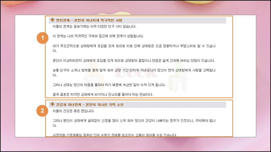 6. 연인의 미래를 엿볼 수 있어요. 대표적인 애정 관계는 연인 관계인데요. 연인이라는 가정 하에 해석한 풀이를 읽어볼 수 있어요. 결혼을 할 수 있는지 알 수 있고, 결혼 이후에 어떤 일이 생기는지도 간단하게 알려줘요. 앞으로의 애정운세가 어떻게 진행되는지 문제는 없는지 확인이 가능합니다.