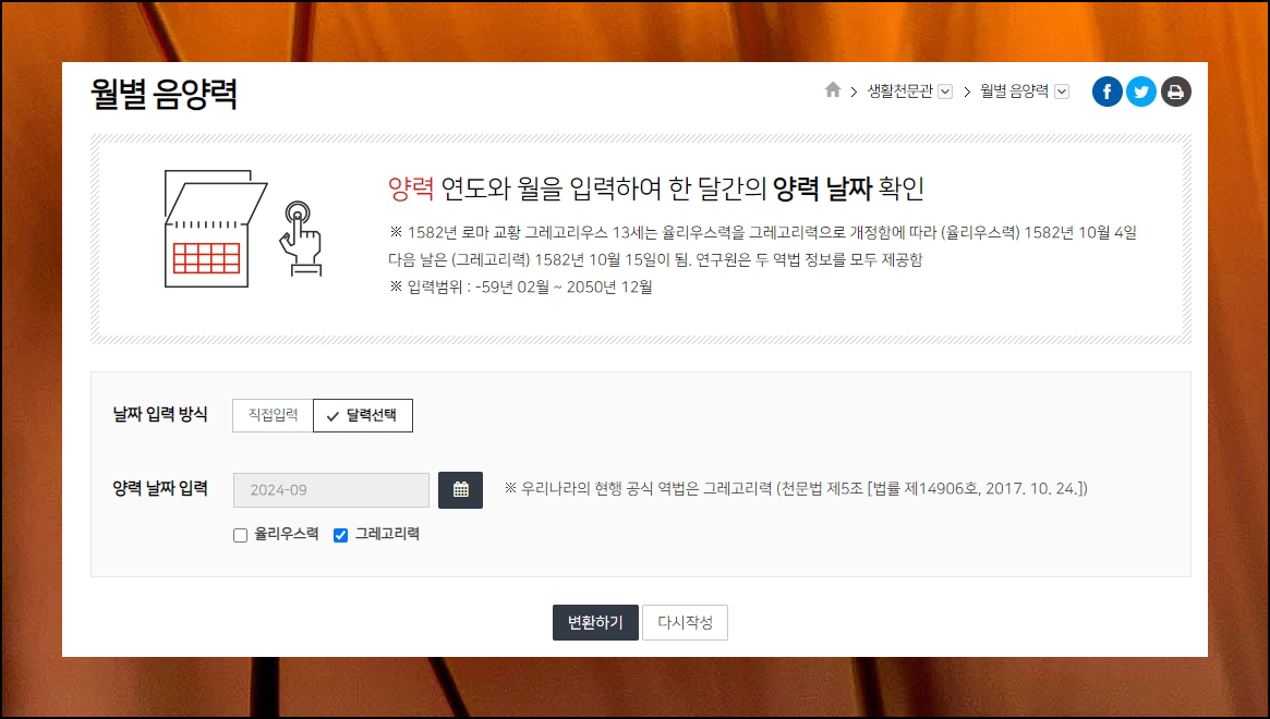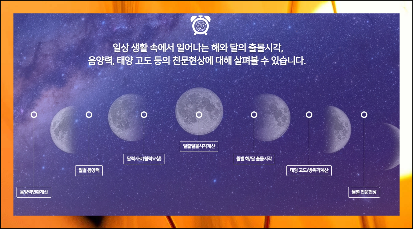 한국천문연구원이 제공하는 "생활천문관" 서비스는 다양한 천문학적 계산 도구를 제공합니다. 이 사이트에서는 "달력자료", "일출일몰 시각계산", "월별 해와 달 출몰시간", "태양 고도 및 방위각 계산" 등 여러 유용한 기능을 찾아볼 수 있습니다. 특히 우리가 주목할 것은 첫 번째 옵션인 "음력 양력 변환기"입니다.