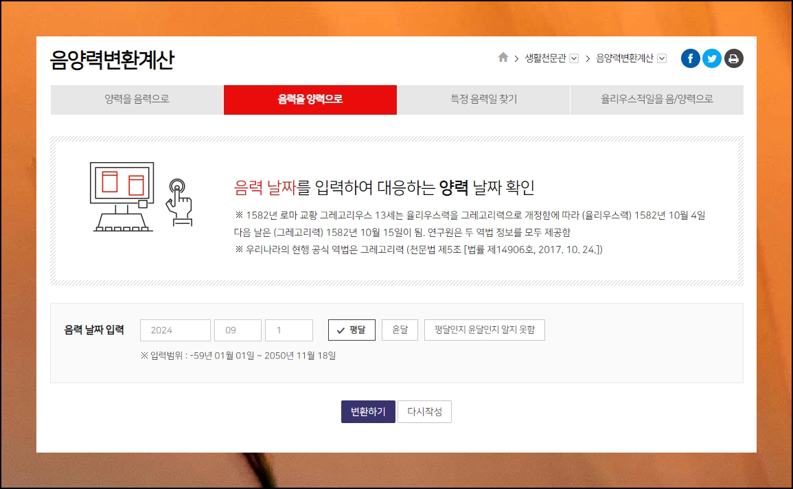 반대 방향의 변환, 즉 음력에서 양력으로의 변환도 동일한 방식으로 이루어집니다. 날짜를 입력하면 해당하는 결과값을 다양한 방식으로 확인할 수 있습니다.