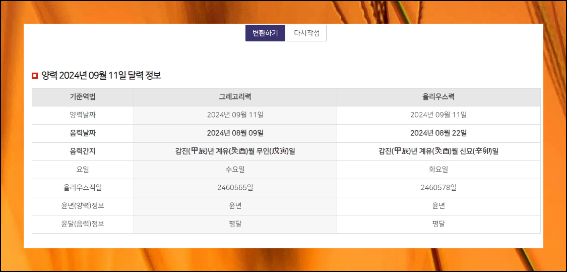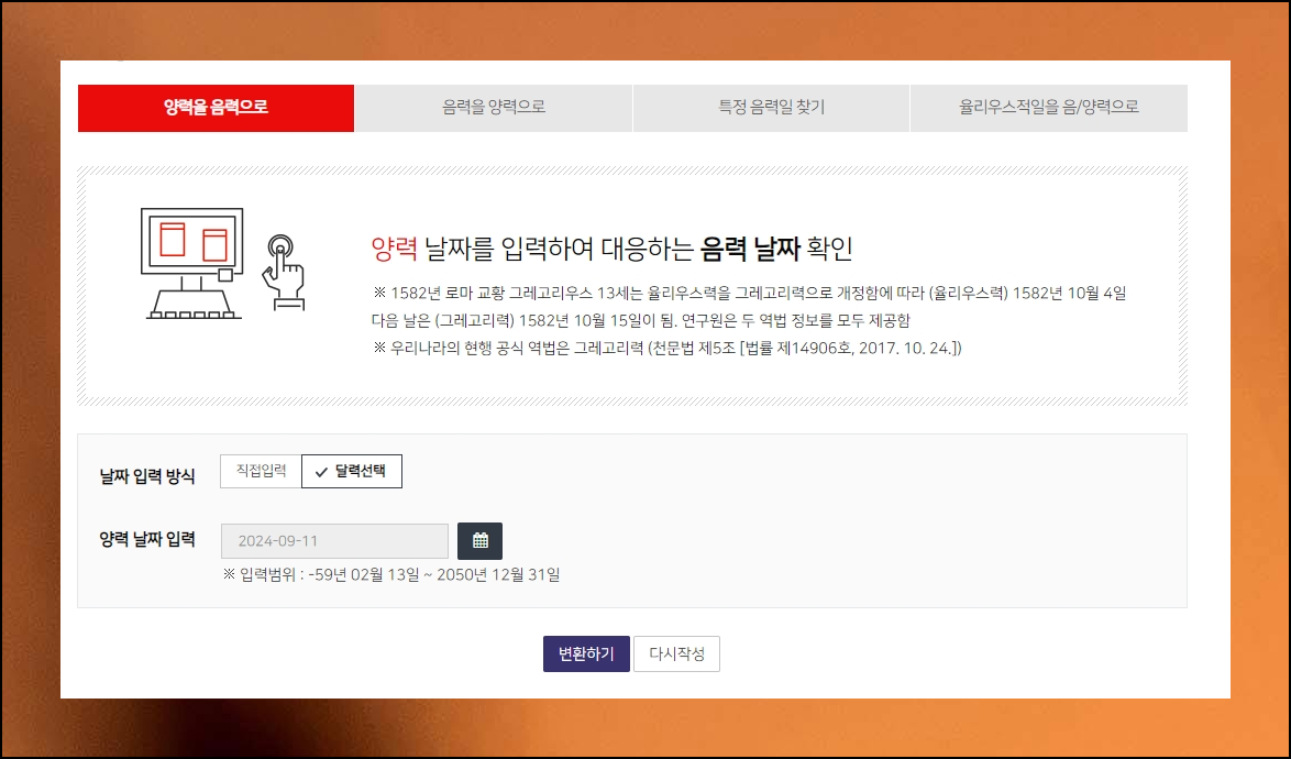 반대 방향의 변환, 즉 음력에서 양력으로의 변환도 동일한 방식으로 이루어집니다. 날짜를 입력하면 해당하는 결과값을 다양한 방식으로 확인할 수 있습니다.