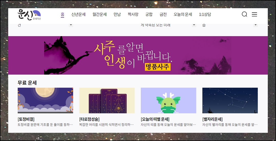 사이트에 접속하면 화면 스크롤을 맨 밑으로 내려보세요. 그럼 무료 운세 서비스를 찾을 수 있는데요. 동양의 사주팔자는 물론이고, 서양에서 많이 이용하는 타로점성술이나 별자리운세도 무료로 볼 수 있습니다.