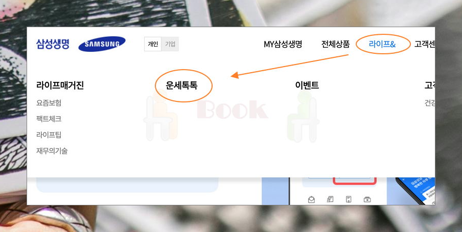 요즘에는 규모 있는 기업의 홈페이지에서 역술 서비스를 제공하기도 하는데요. 아무래도 사이트를 방문하는 사람들에게 혜택을 주려고 하는 것 같은데요. 삼성생명의 경우 타로점을 볼 수 있는데요. 공식 홈페이지에서 [라이프&]에 있는 [운세톡톡] 서비스를 이용하면 돼요.
