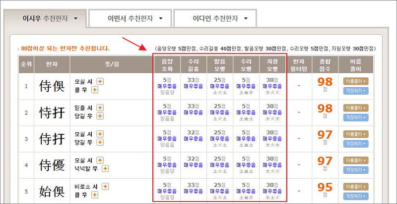 ▼ 저는 "이시우", "이민서", "이다인" 이렇게 3가지 이름을 선택했습니다. "이시우"에 대한 추천한자를 먼저 살펴보겠습니다. 5개의 뜻 좋은 한자를 추천 받았습니다. 음양조화, 발음오행, 수리오행, 자원오행, 수리길흉에 대하여 매우 좋은 점수를 받고 있습니다. 한자의 뜻도 나와 있기 때문에 얼마나 뜻이 좋은지 직접 확인할 수 있습니다.
