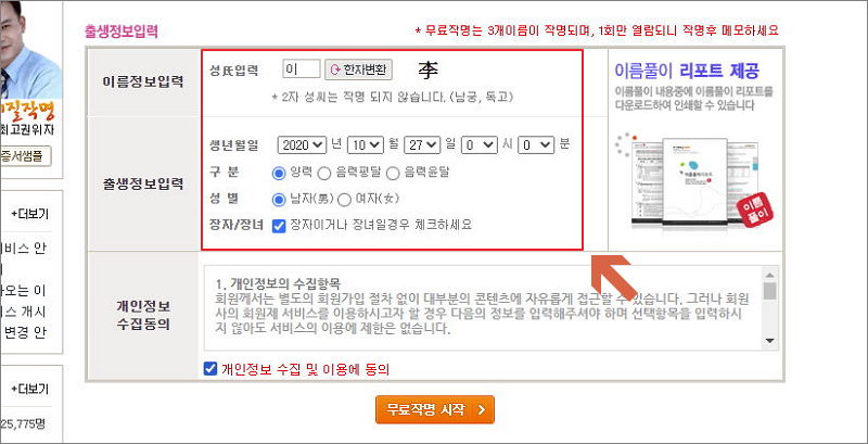 ▼ 해당 서비스를 이용하기 위해서는 출생정보를 입력해야 합니다. 성씨, 태어난 날짜, 태어난 시각, 성별, 장자 또는 자녀 여부 입니다. 참고로 작명 서비스를 통해 좋은 이름모음을 확인하는 것은 횟수 제한이 있습니다. 1회만 열람할 수 있기 때문에 마음에 드는 성명이 있으면 메모를 하는 것이 좋습니다.