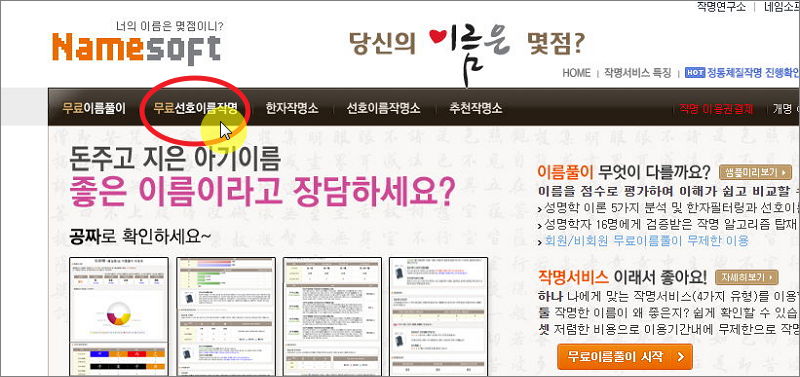 ▼ 개명이나 작명을 할 때 유용한 사이트가 있습니다. 바로 "네임소프트" 입니다. 이곳에서는 뜻도 좋고, 성명학에 기반으로 좋은 이름모음을 많이 찾아볼 수 있습니다. 사이트에 접속해서 어떻게 이용하는지 차례차례 알려드리겠습니다.