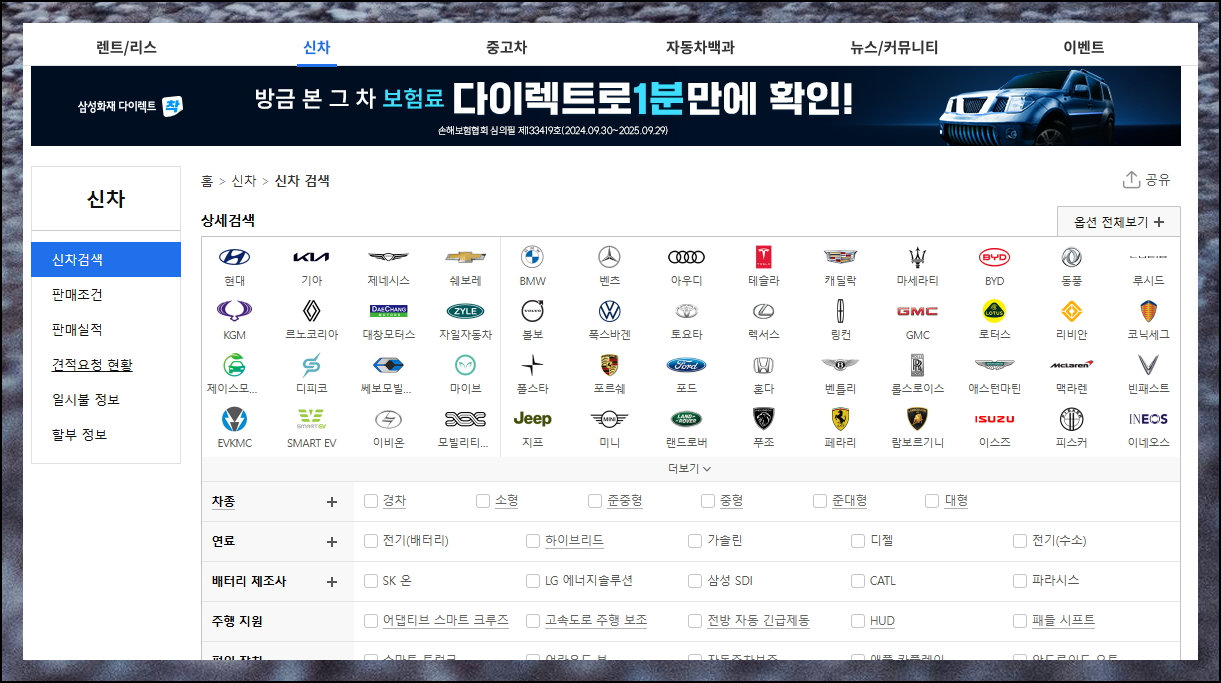 자동차 검색 시에는 신차 견적 메뉴를 활용하세요. 제조사별, 연료타입별, 차종별로 검색이 가능하며 주행 보조 기능까지 세세하게 선택할 수 있습니다.