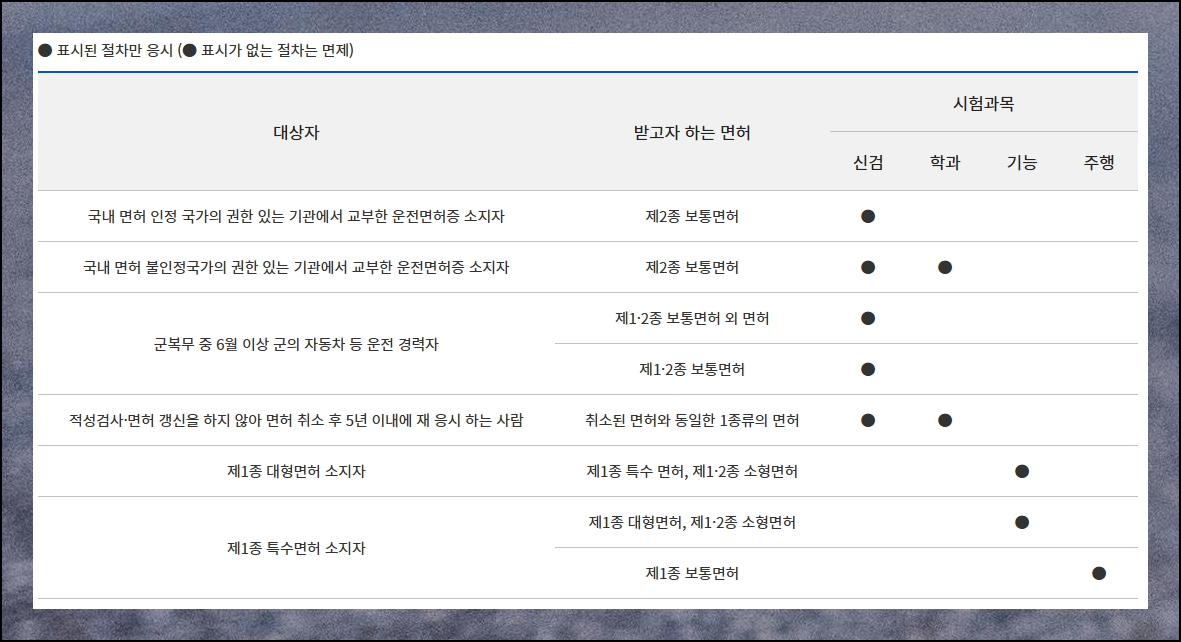 특수면허 를 가지고 계신 분들은 1종보통면허 취득 시 주행시험만 응시하면 됩니다. 다른 시험은 면제되니 큰 혜택이라고 할 수 있어요.