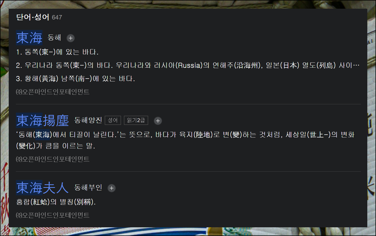 네이버 한문사전에서 "동해"를 검색해보니 같은 발음으로 4가지나 되는 다른 한자어가 있습니다. 이처럼 동음이의어가 많을 때는 한글과 한문의 정확한 의미를 찾는 것이 매우 중요합니다. 한문사전을 통해 바꾸기 원하는 정확한 단어의 의미를 파악할 수 있어요.