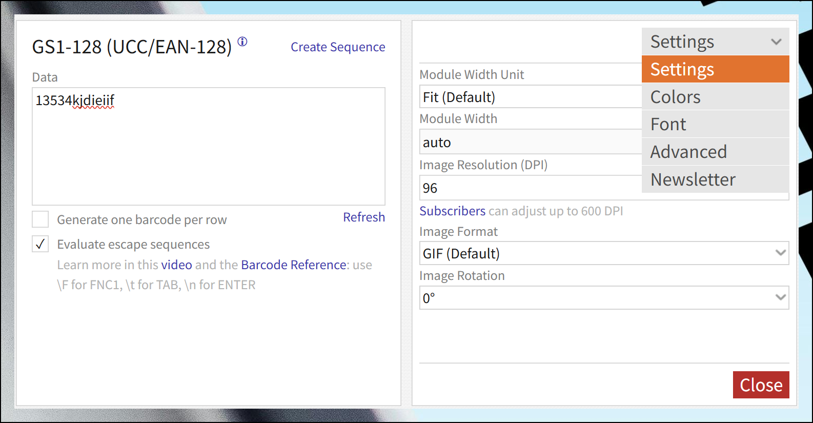 상단 우측의 톱니바퀴 아이콘으로 세부 설정이 가능합니다. 바코드의 컬러와 사이즈, 이미지 형식 변경은 물론 회전 각도까지 조절할 수 있어요. 바코드 만들기의 마지막 단계입니다.