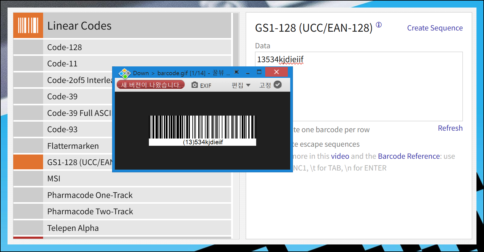 입력한 내용은 Refresh 버튼을 눌러 확인할 수 있어요. 프로그램 우측의 미리보기 창에서 만들어진 바코드를 바로 확인해 보세요. 바코드 만들기 과정이 순조롭게 진행되고 있습니다.