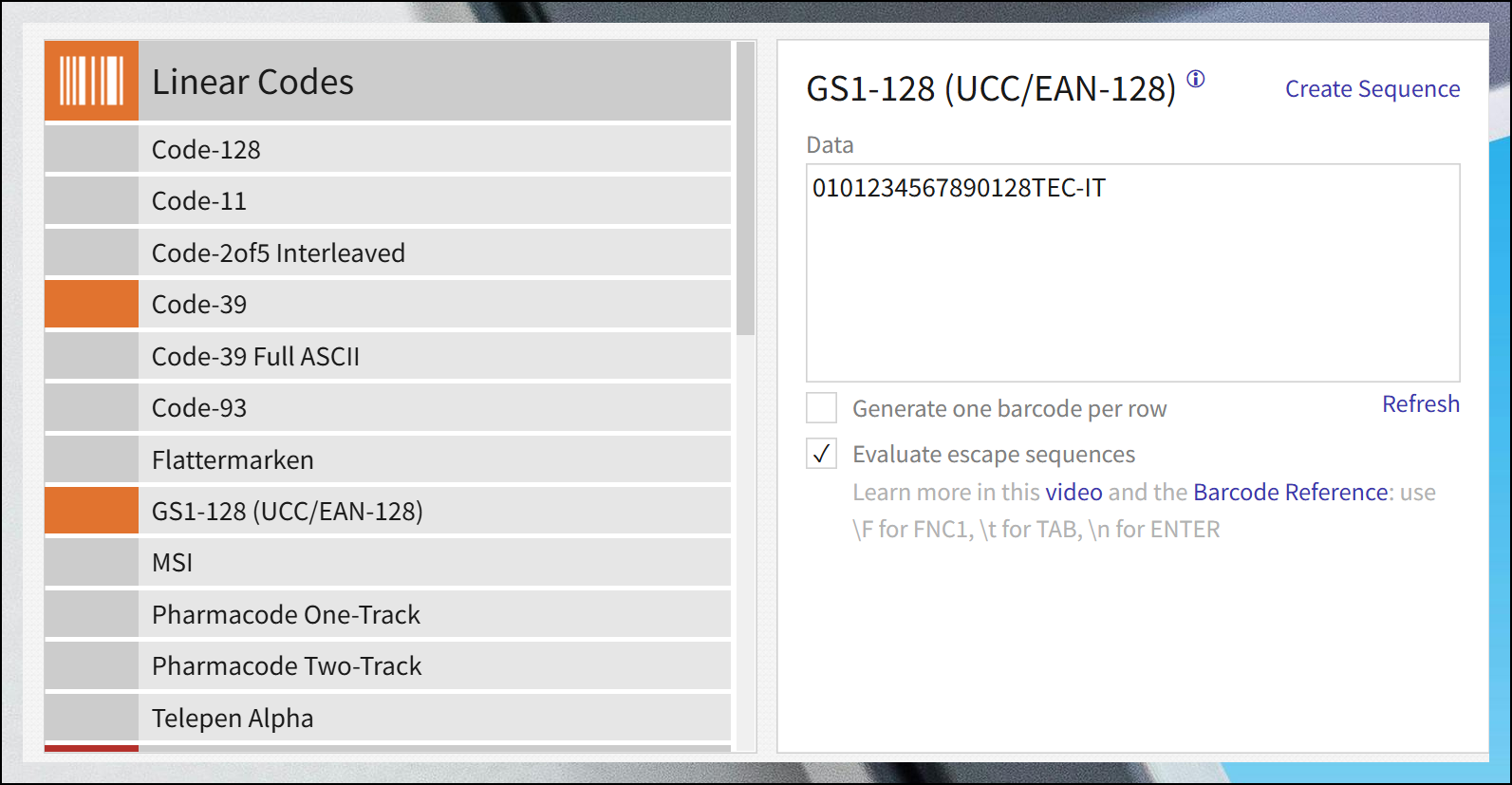 선형 방식의 메뉴를 선택해 볼게요. 그럼 세부 유형이 나옵니다. 원하는 유형을 고른 다음 프로그램 중앙의 Data 입력창에 필요한 정보를 넣어주세요. 바코드 만들기 전 확인이 필요합니다.