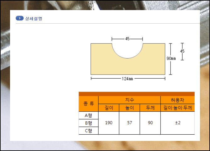 시멘트블록 중 C종 이형 블록의 경우 제품명과 규격뿐 아니라 상세한 설명도 제공됩니다. 도면과 함께 정확한 치수를 확인할 수 있어 이해하기 쉽고, 페이지 하단에는 약 50개의 생산업체 정보가 수록되어 있어요. 생산업체의 회사명, 주소, 연락처 등을 참고하실 수 있습니다.