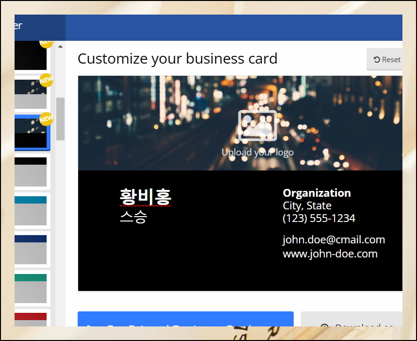 프로그램 사용법이 매우 직관적이에요. 원하는 내용으로 수정이 간단해요. 영문으로 표시된 부분을 클릭하면 바로 수정할 수 있죠. 명함 제작 시 로고 삽입도 어렵지 않습니다. 프로그램의 업로드 버튼을 통해 기존 로고를 넣거나, 새로운 로고를 만들어 사용할 수 있어요. 전문 제작 도구처럼 세세한 조정도 가능합니다.