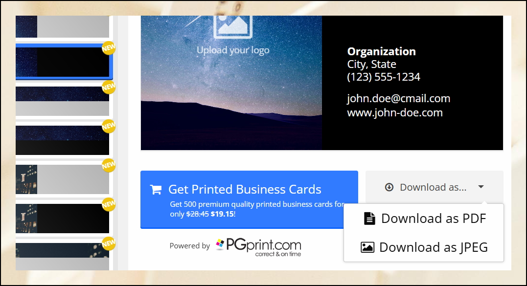 로고 걱정도 덜어드려요. Create a logo 기능을 활용하면 회사명만으로도 로고를 만들 수 있습니다. 자동으로 제작되는 로고 디자인으로 시간과 노력을 아낄 수 있어요. 명함 제작 과정에서 로고까지 한 번에 해결할 수 있는 프로그램이라 더욱 효율적이네요.