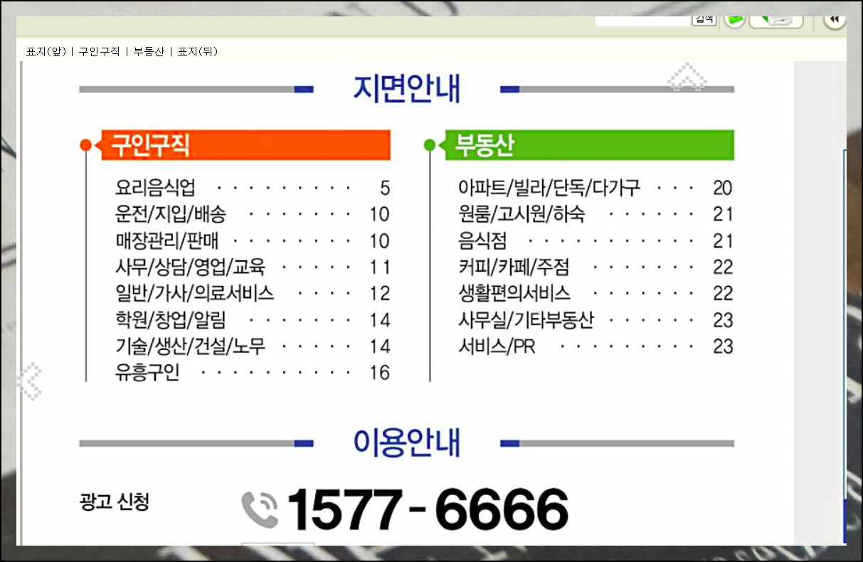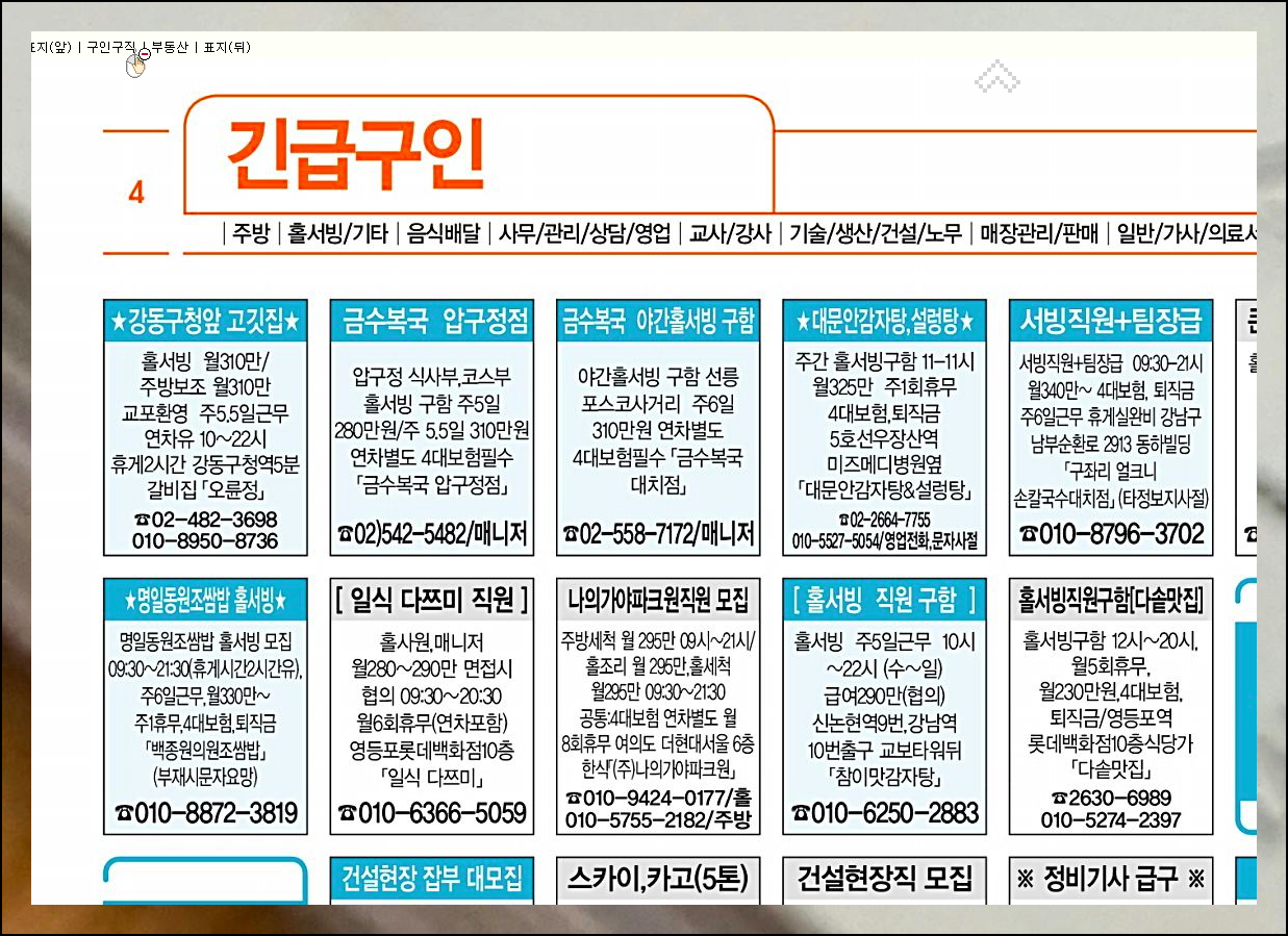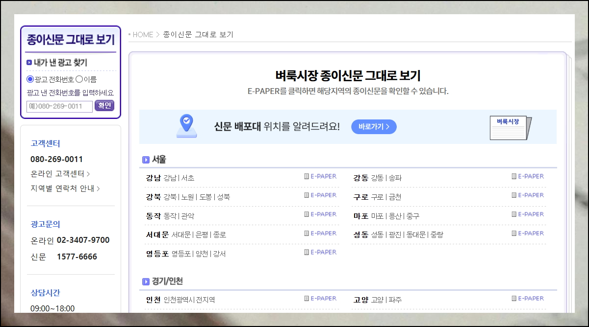 광고를 게재하신 경우 이름과 전화번호로 쉽게 검색이 가능합니다. 벼룩시장 종이신문은 각 지역별로 발행되니 본인 거주지의 E-PAPER를 선택해주세요. 서울 강남권 신문을 예시로 살펴보도록 하겠습니다. 구인구직 정보는 지역별로 상세하게 분류되어 있어요.