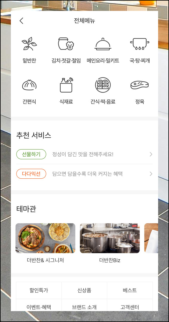 스마트폰에서 앱을 내려받으면 회원 등록 없이도 반찬 정보를 둘러볼 수 있습니다. 메뉴에서 종류별 카테고리를 선택하면 국물요리부터 메인요리, 샐러드, 어린이용 반찬까지 50가지가 넘는 다양한 메뉴를 확인할 수 있어요. 도시락 구성을 위한 여러 종류의 메뉴가 체계적으로 정리되어 있습니다.