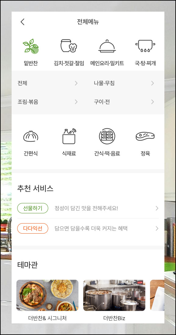 스마트폰에서 앱을 내려받으면 회원 등록 없이도 반찬 정보를 둘러볼 수 있습니다. 메뉴에서 종류별 카테고리를 선택하면 국물요리부터 메인요리, 샐러드, 어린이용 반찬까지 50가지가 넘는 다양한 메뉴를 확인할 수 있어요. 도시락 구성을 위한 여러 종류의 메뉴가 체계적으로 정리되어 있습니다.