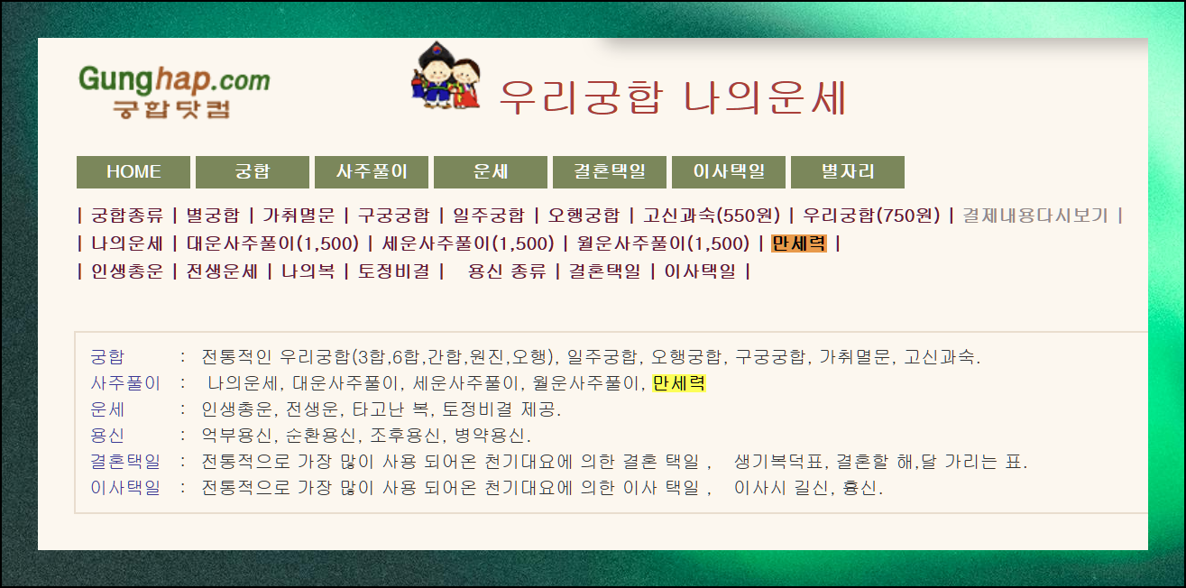 궁합부터 택일까지 여러 역술 서비스를 한눈에 확인할 수 있어요. 대부분의 서비스가 무료로 제공되니 부담 없이 이용해 보세요. 만세력 풀이도 쉽게 찾아볼 수 있답니다.