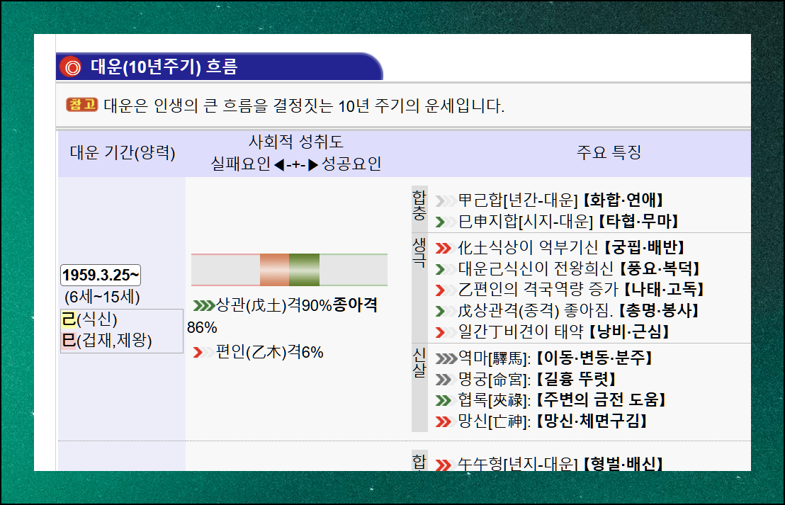 10년 단위의 대운과 매년 바뀌는 세운 정보가 있습니다. 만세력 해석은 직접 해야 하지만 기본적인 흐름을 파악하기에 좋아요. 운의 흐름을 이해하는데 도움이 될 거예요.