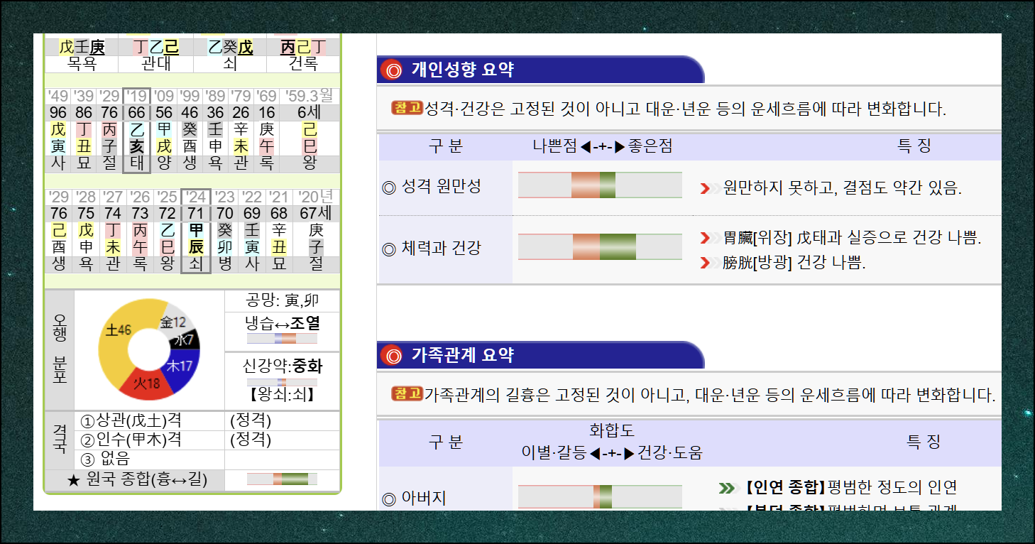 만세력을 통해 성격과 건강, 용모까지 살펴볼 수 있습니다. 오행 분포와 대운도 함께 확인해 보세요. 자신의 특성을 이해하는데 많은 도움이 될 거예요.