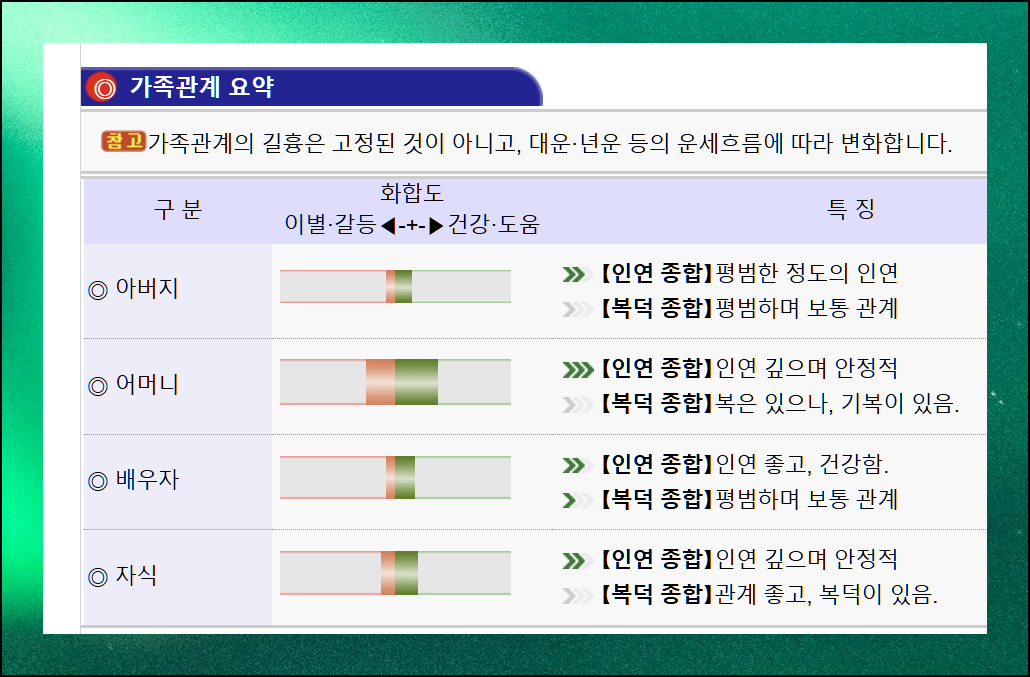 가족과 주변 사람들과의 관계도 알아볼 수 있어요. 복덕과 인연의 흐름을 확인하면 좋습니다. 대인관계의 특징도 파악할 수 있답니다.