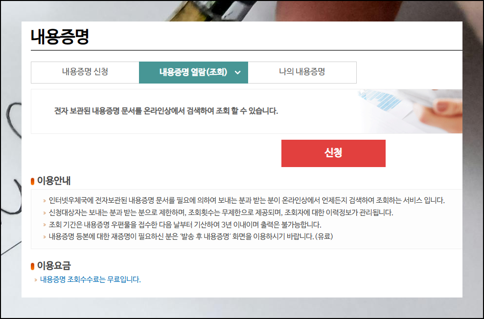 발송한 내용증명은 우체국 사이트에서 무료로 조회할 수 있습니다. 열람 메뉴에서 신청 버튼을 누르면 발송한 내용을 언제든지 확인할 수 있어요. 문서 보관이나 출력도 가능하니 필요할 때 활용하세요.