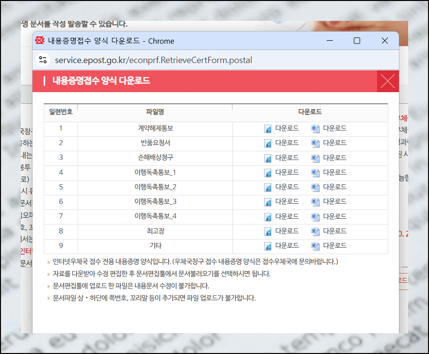 내용증명 발송을 위한 첫 단계는 신청 버튼을 누르는 것입니다. 필요한 양식은 하단의 버튼을 통해 내려받을 수 있어요. 문서 작성에 필요한 기본 서식도 함께 제공되니 참고하시면 좋습니다.
