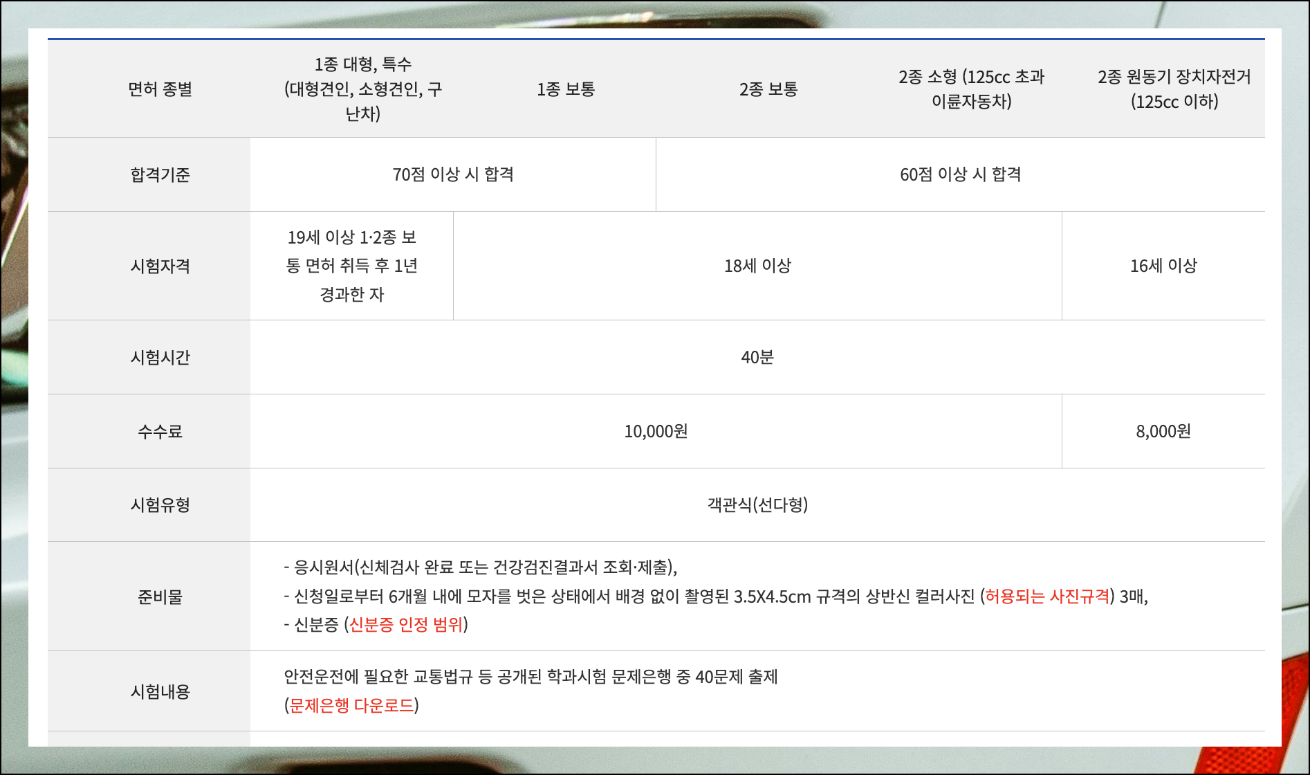 면허 종류마다 합격 기준이 달라요. 시험시간은 40분으로 동일하며, 원동기면허는 8000원으로 저렴한 편입니다. 40문항의 예상문제 자료를 다운로드하여 효율적으로 공부할 수 있어요.