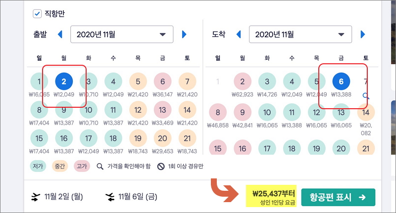 ▼ 저는 가는날과 오는날을 2020년 11월로 선택했습니다. 이렇게 하면 11월에 포함된 각각의 날에 대하여 최저가 항공권의 가격을 확인할 수 있습니다. 저는 사이트에서 2일과 6일을 선택했습니다. 그럼 2일과 6일에 예약할 수 있는 최저가 티켓의 금액을 알 수 있습니다. 선택한 결과를 살펴보면 최저가로 왕복항공권의 가격이 25,437원임을 알 수 있습니다.