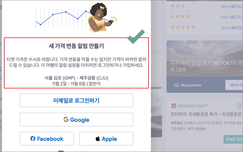 ▼ 당장 티켓 예약을 진행할 것이 아니라면 스카이스캐너 사이트에서 좌측 상단에 있는 "가격 변동 알림 받기"를 클릭합니다. 그럼 저렴하게 예약할 수 있는 티켓이 생겼을 때 이메일로 알림을 받을 수 있습니다.