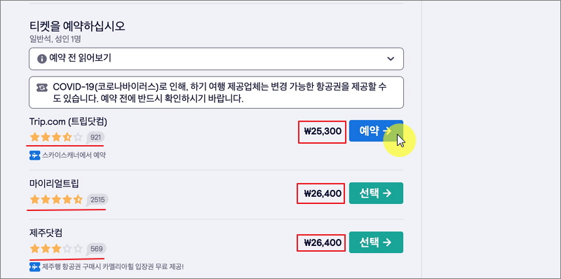 ▼ 방금 찾아본 항공권 중에서 예약을 하고 싶은 것이 있을 수 있습니다. 이러한 경우에는 항공편 리스트에서 가장 우측에 있는 "선택" 버튼을 클릭합니다. 그럼 티켓 예약을 진행할 수 있습니다. 예약 사이트로 이동하기 이전에 업체를 선택해야 합니다. 깊게 고민할 필요 없이 가격이 저렴하거나 높은 평가를 받는 곳을 선택하면 됩니다.