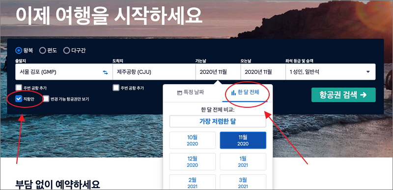 ▼ 스카이스캐너 사이트에 접속했습니다. 메인화면에서 예약을 진행할 항공권에 대한 정보를 입력합니다. 출발지, 도착지, 가는날, 오는날, 좌석 등급 및 승객 수를 차례대로 입력하면 됩니다. 여기에서 팁을 하나 알려드리겠습니다. 날짜를 입력할 때 "한 달 전체"를 선택해보시길 바랍니다. 그럼 해당 월에서 항공권을 가장 싸게 예약할 수 있는 날을 찾을 수 있습니다.
