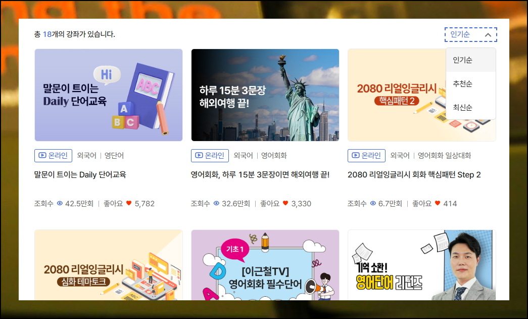여러 개의 강좌 중에서 고민된다면 인기강좌 정렬을 활용해보세요. 많은 사람들이 선택한 좋은방법부터 볼 수 있어요. 우측 상단의 정렬 기능을 사용하면 쉽게 찾을 수 있습니다.
