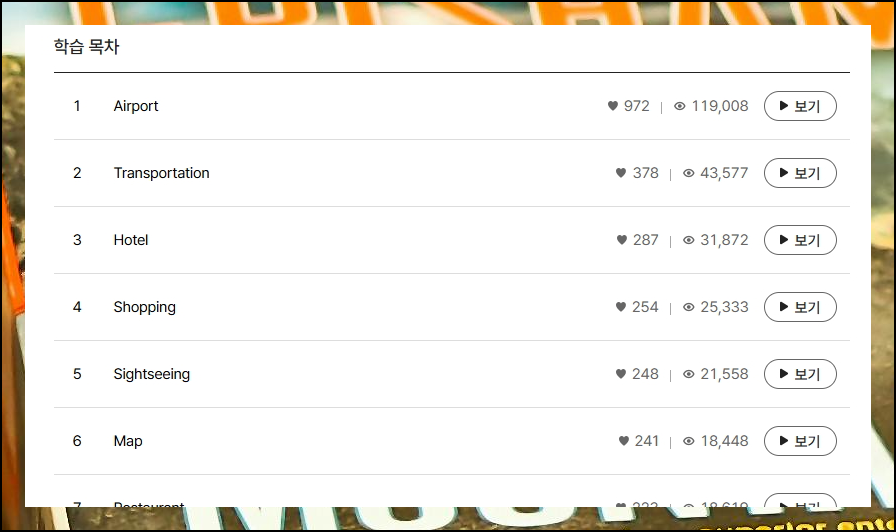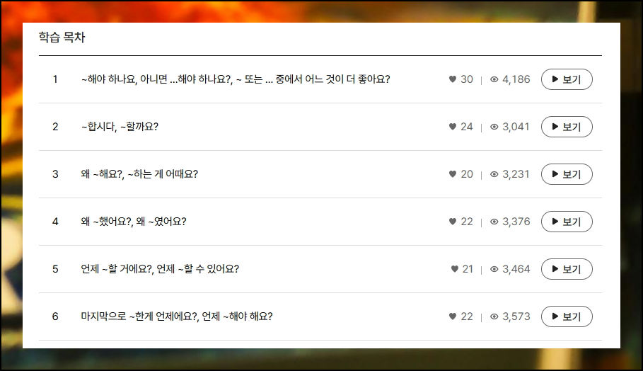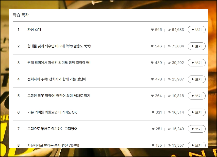 각 차시는 독립적으로 들을 수 있어요. 목차를 보고 원하는 부분만 선택해서 영어회화 공부를 할 수 있습니다. 자신의 페이스대로 실력을 키워보세요. 제가 안내해 드린 공부 혼자하기 좋은방법으로 시작해보는 건 어떨까요?