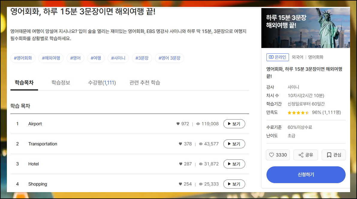 각 강좌마다 자세한 설명이 있어요. 예를 들어 하루 15분 영어회화 3문장 배우기 강좌는 10차시로 구성되어 있죠. 강의 시간과 목차를 미리 볼 수 있어서 공부 혼자하기 계획 세우기가 쉽습니다.