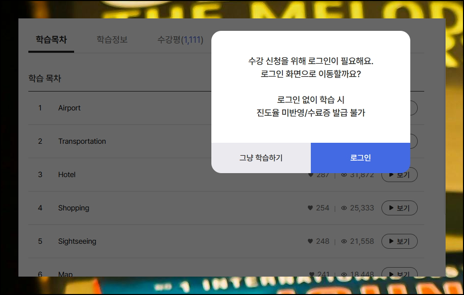 영어회화 실력 향상을 위해 로그인하면 진도와 수료증을 받을 수 있어요. 하지만 좋은방법으로 그냥 배우고 싶다면 로그인 없이도 가능합니다. 자유롭게 선택해서 시청각 자료로 배워보세요.