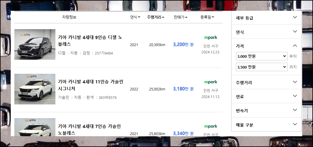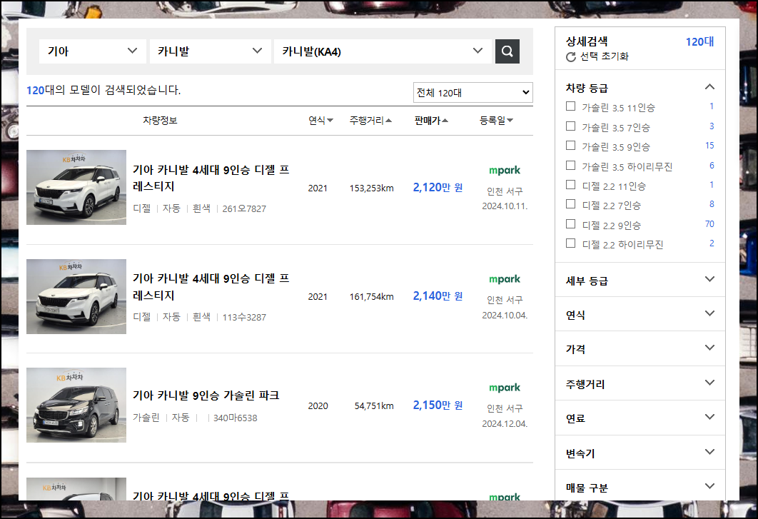 카니발 모델을 예시로 살펴보니 여러 매매단지에서 새로운 매물이 계속 올라오고 있네요. 기본 시세표도 좋지만 상세검색을 활용하면 더 스마트하게 찾을 수 있습니다. 중고차 매물을 검색할 때는 등록일도 꼭 체크해보세요.