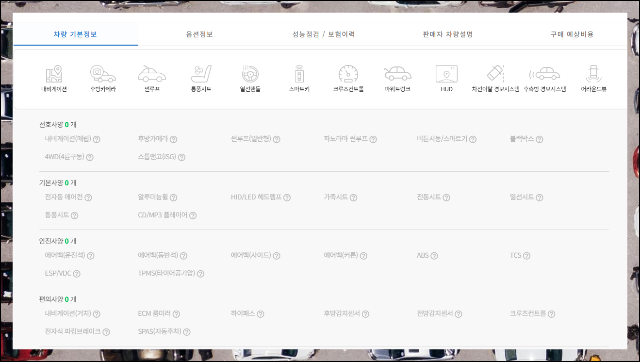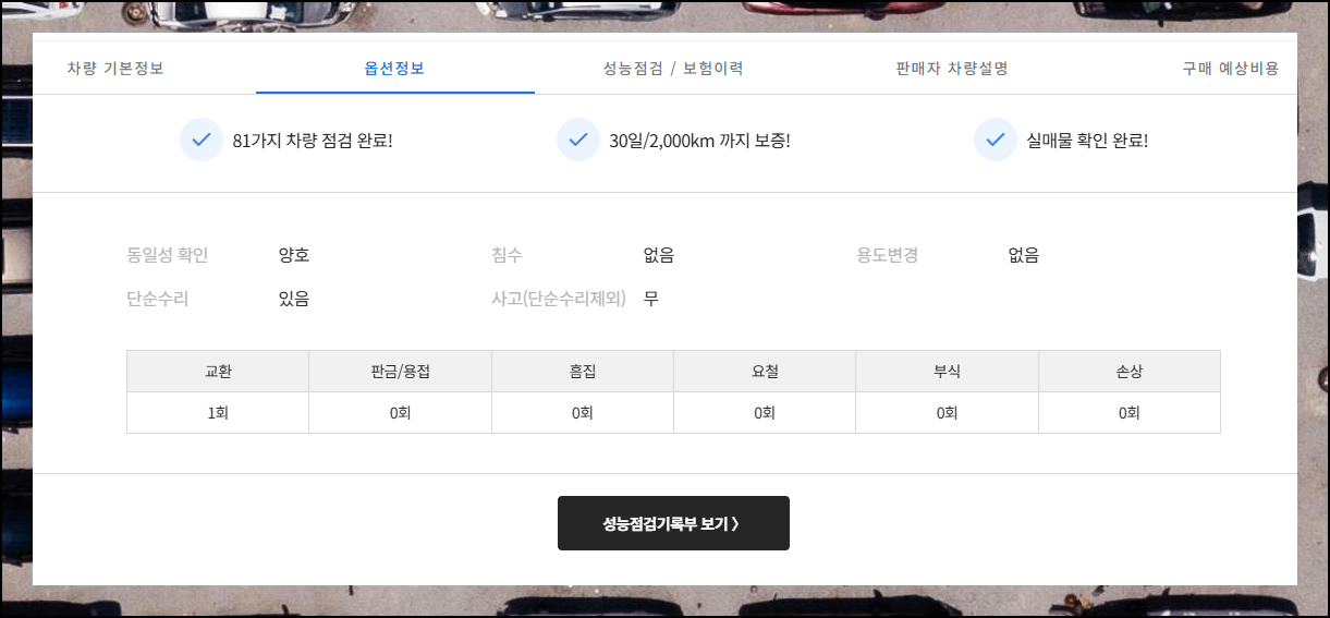 마음에 드는 매물을 클릭하면 다양한 각도의 사진과 성능 점검 내역을 확인할 수 있어요. 가격이 저렴한 차량은 보통 옵션이 적은 편이니 꼭 체크해보세요. 옵션은 나중에 바꾸기 어려우니 신중하게 결정하는 게 좋습니다.