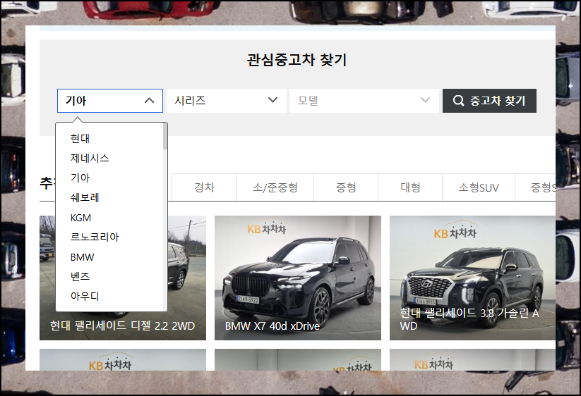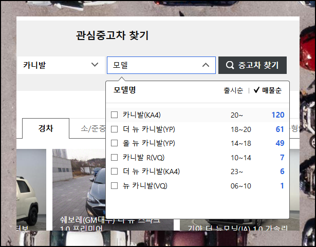 원하는 차종을 찾을 때는 순서대로 하나씩 선택해 나가면 됩니다. 많은 매물이 있는 차종을 고르면 더 다양한 가격대를 비교해볼 수 있어요. 이렇게 하면 중고차 시장의 실제 시세를 정확하게 파악할 수 있죠.