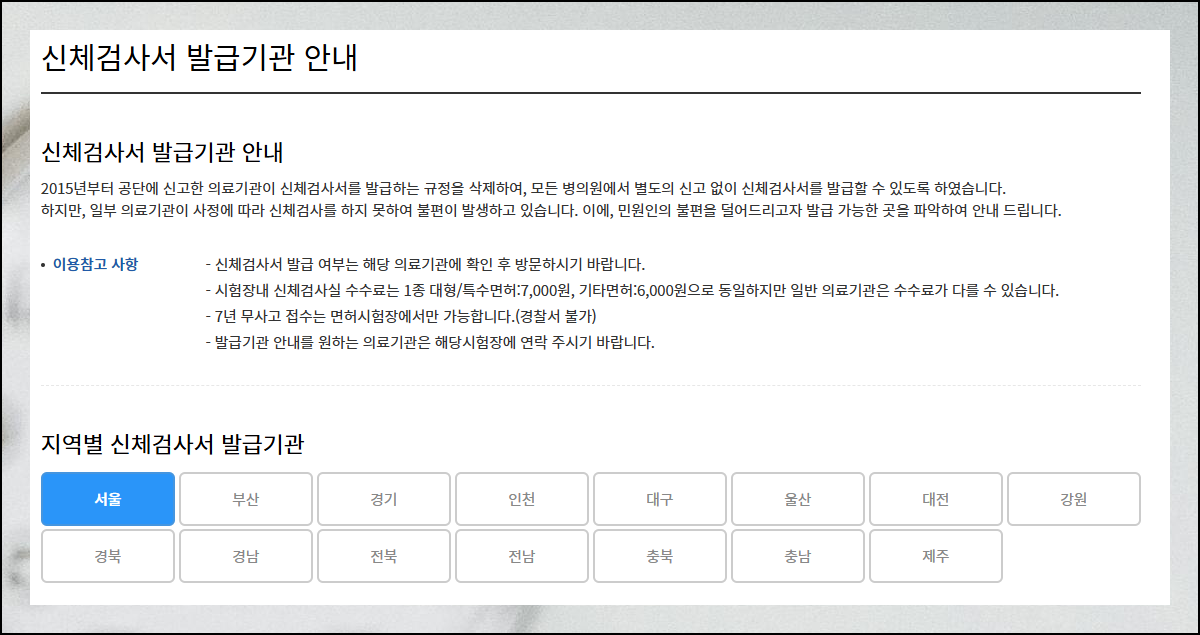 상단 메뉴에서 발급기관 안내를 선택하시면 더 자세한 내용을 볼 수 있어요. 2015년부터는 대부분의 병의원에서 신체검사서를 발급할 수 있게 되었습니다. 하지만 운전면허 검사를 하지 않는 곳도 있으니 미리 확인하세요.