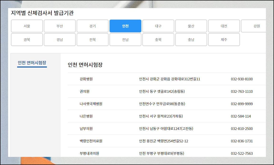 상단 메뉴에서 발급기관 안내를 선택하시면 더 자세한 내용을 볼 수 있어요. 2015년부터는 대부분의 병의원에서 신체검사서를 발급할 수 있게 되었습니다. 하지만 운전면허 검사를 하지 않는 곳도 있으니 미리 확인하세요.