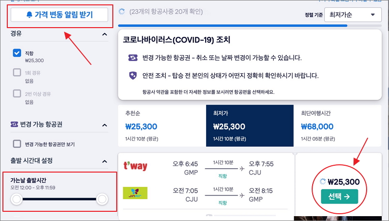 ▼ 당장 티켓 예약을 진행할 것이 아니라면 스카이스캐너 사이트에서 좌측 상단에 있는 "가격 변동 알림 받기"를 클릭합니다. 그럼 저렴하게 예약할 수 있는 티켓이 생겼을 때 이메일로 알림을 받을 수 있습니다.