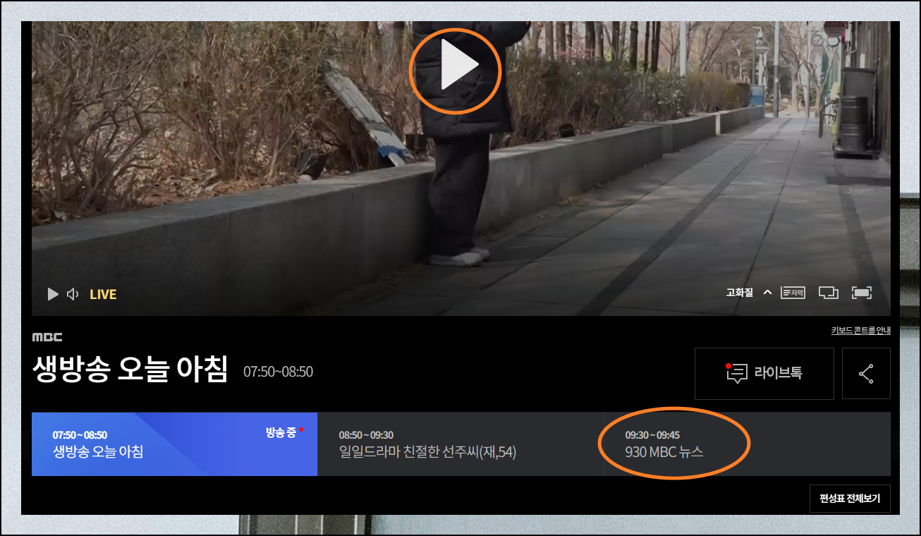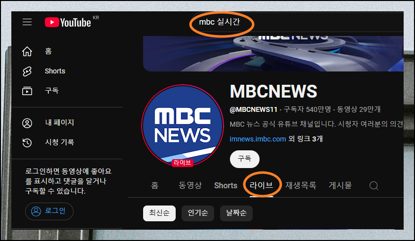 취향에 맞는 채널과 프로그램을 골라 보기할 수 있어요. 실시간 방송은 물론 지난 방송도 다시 볼 수 있죠. 참고로 SBS와 KBS에서도 무료로 온에어 서비스를 제공하고 있으니 함께 이용해보세요. 그리고 mbc 뉴스만 보는 경우라면 다음과 같이 유튜브 라이브 방송을 이용하는 것도 좋습니다. 무료이기 때문에 부담이 전혀 없어요.