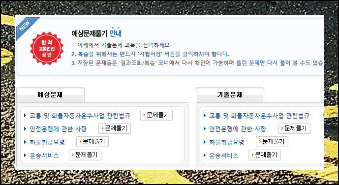 운전자격 기출문제 풀이는 다음과 같은 웹사이트를 통해 진행할 수 있습니다. 검색엔진을 통해 손쉽게 접속할 수 있으니 도전해보세요. 실전 감각을 키우는데 매우 유익합니다.