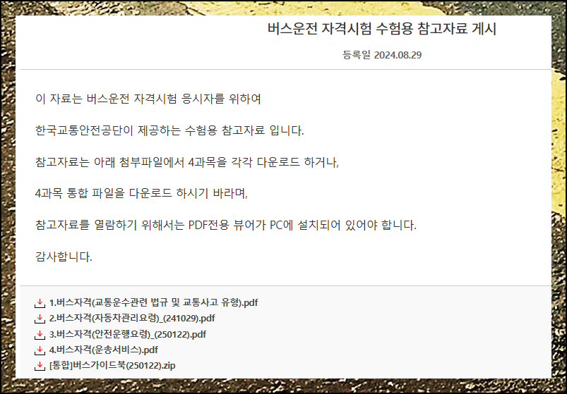 새롭게 업데이트된 버스 자격 참고자료를 확인하세요. 2024년 8월 29일 버전이 가장 최근이니 꼭 이것으로 준비하시기 바랍니다. 통과를 위해서는 최신 정보가 필수예요.