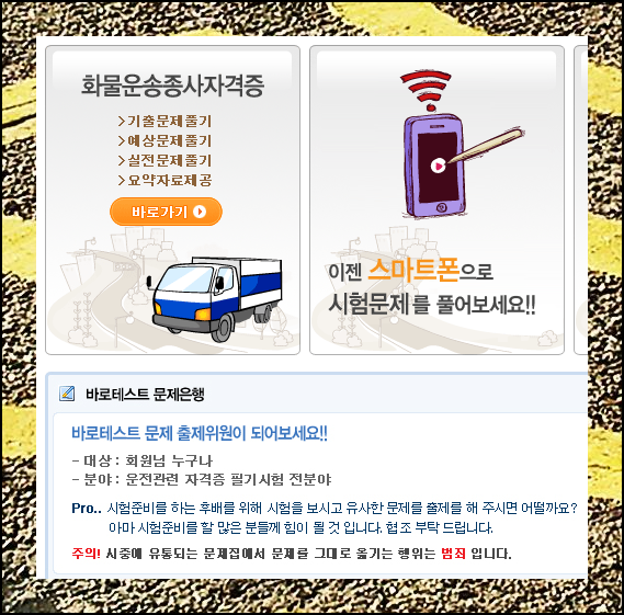 운전자격 기출문제 풀이는 다음과 같은 웹사이트를 통해 진행할 수 있습니다. 검색엔진을 통해 손쉽게 접속할 수 있으니 도전해보세요. 실전 감각을 키우는데 매우 유익합니다.