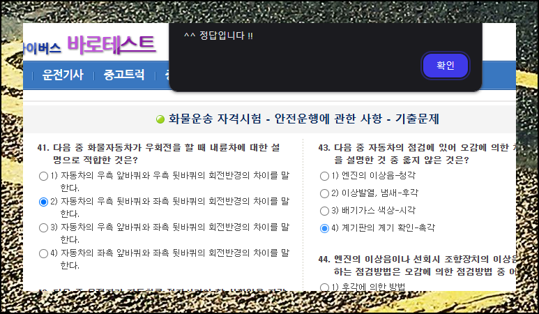 온라인으로 바로 문제를 풀어보겠습니다. 정답을 고르면 즉시 결과가 나오니 본인의 실력을 바로 파악할 수 있어요. 버스자격 취득에 큰 도움이 되는 서비스입니다.