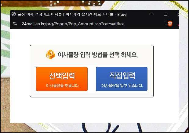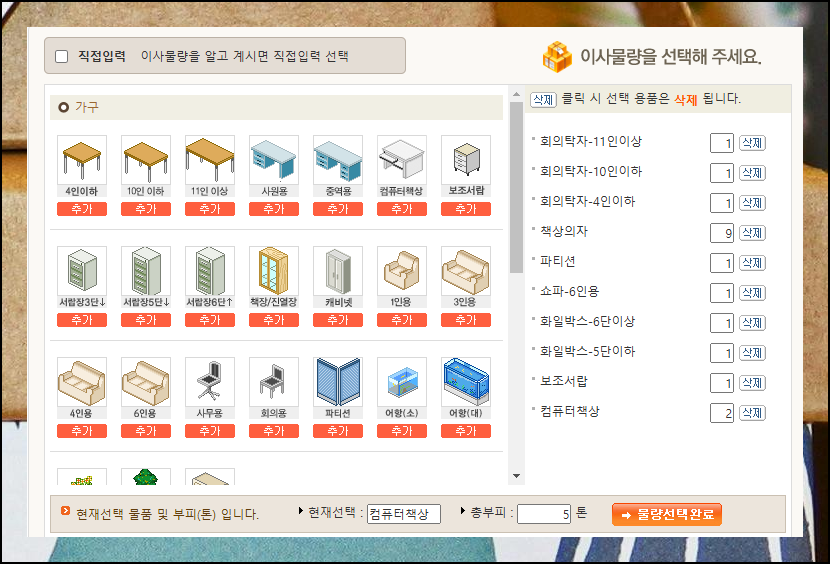 이삿짐 물량을 꼼꼼히 체크해보세요. 미리 파악한 물건들이 있다면 '선택입력'을 선택하고, 아직 확실하지 않다면 '직접입력'을 통해 컴퓨터, 프린터, 복사기 등 사무용품을 하나씩 선별할 수 있습니다. 빠짐없이 체크해야 더 정확한 비용 계산이 가능해요. 사무실 내 모든 물품을 상세히 기록하면 이사 당일에 예상치 못한 요금 추가가 발생하는 것을 방지할 수 있답니다.